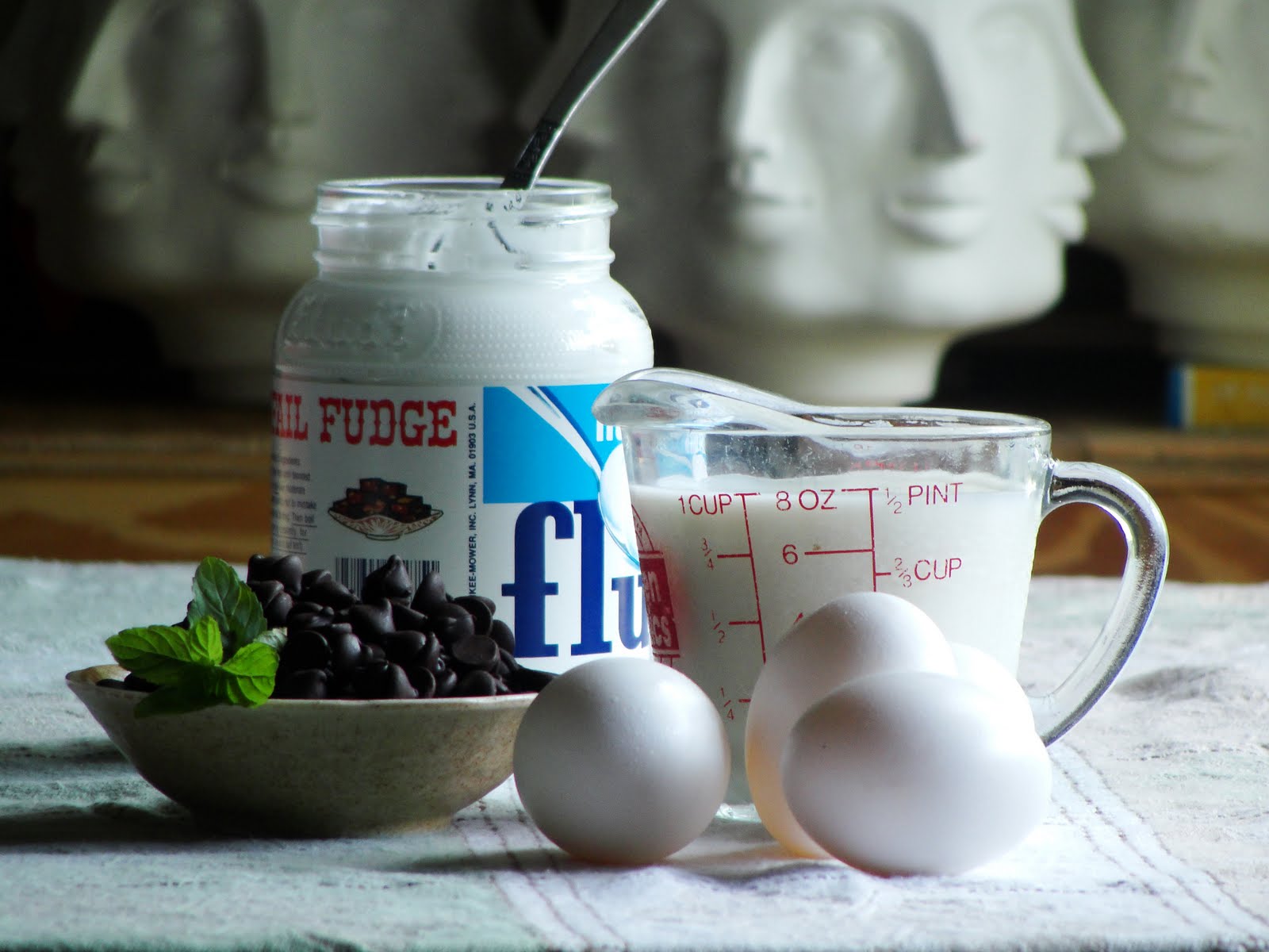 To start the ice cream mix milk, cream and mint in a large sauce pan and slowly warm it up. Meanwhile, mix the egg yolks and sugar in a separate bowl. When the cream and milk begins to steam, mix a few spoonful into the egg, then a ladle, then dump all the egg into the cream and stir. Keep it on the heat until it just begins to bubble, then take it off and let it cool. It should be thickish.